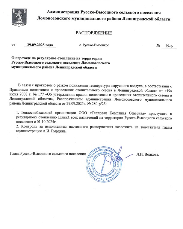 О переходе на регулярное отопление на территории Русско-Высоцкого сельского поселения