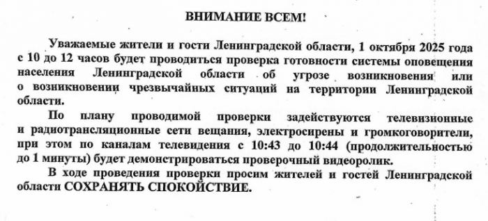 О проведении 01.10.2025 комплексной проверки готовности системы оповещения населения Ленинградской области!