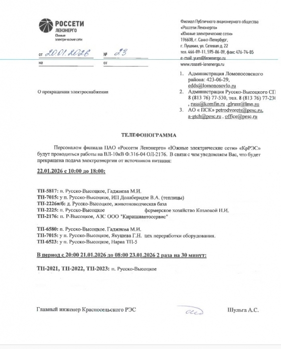 ОТКЛЮЧЕНИЕ ЭЛЕКТРОЭНЕРГИИ 22-23.01.2026