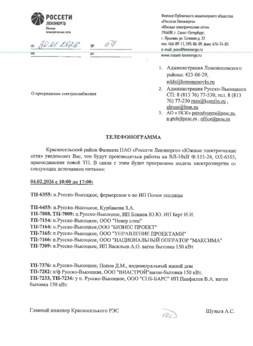 ОТКЛЮЧЕНИЕ ЭЛЕКТРОСНАБЖЕНИЯ 04.02.2026