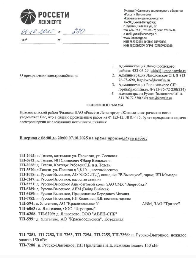 ОТКЛЮЧЕНИЕ ЭЛЕКТРОСНАБЖЕНИЯ 07.10.2025