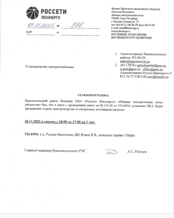 ОТКЛЮЧЕНИЕ ЭЛЕКТРОСНАБЖЕНИЯ 10.11.2025