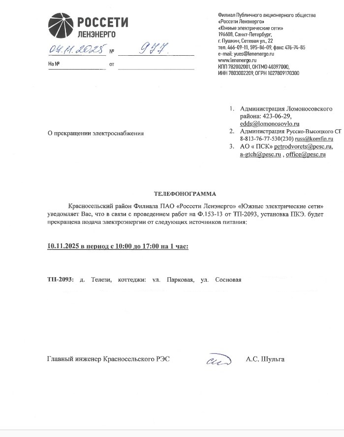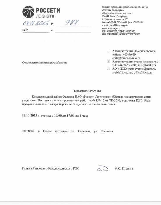 ОТКЛЮЧЕНИЕ ЭЛЕКТРОСНАБЖЕНИЯ 10.11.2025