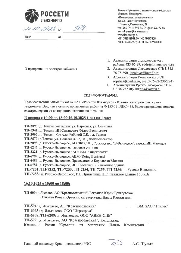 ОТКЛЮЧЕНИЕ ЭЛЕКТРОСНАБЖЕНИЯ 16.10.2025