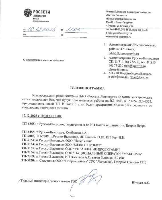 ОТКЛЮЧЕНИЕ ЭЛЕКТРОСНАБЖЕНИЯ 17.12.2025