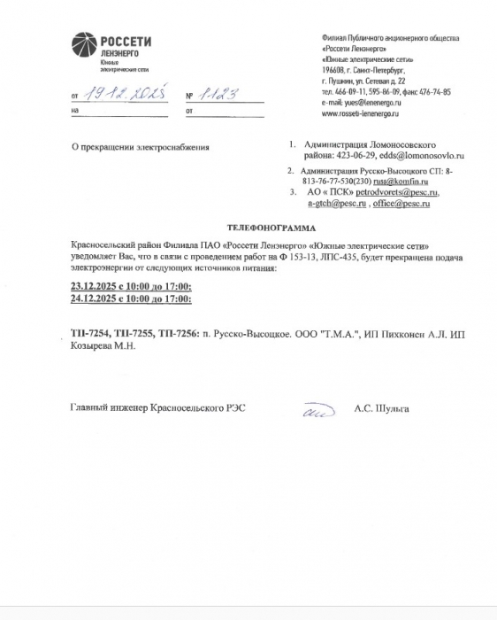 ОТКЛЮЧЕНИЕ ЭЛЕКТРОСНАБЖЕНИЯ 23 и 24.12.2025 года