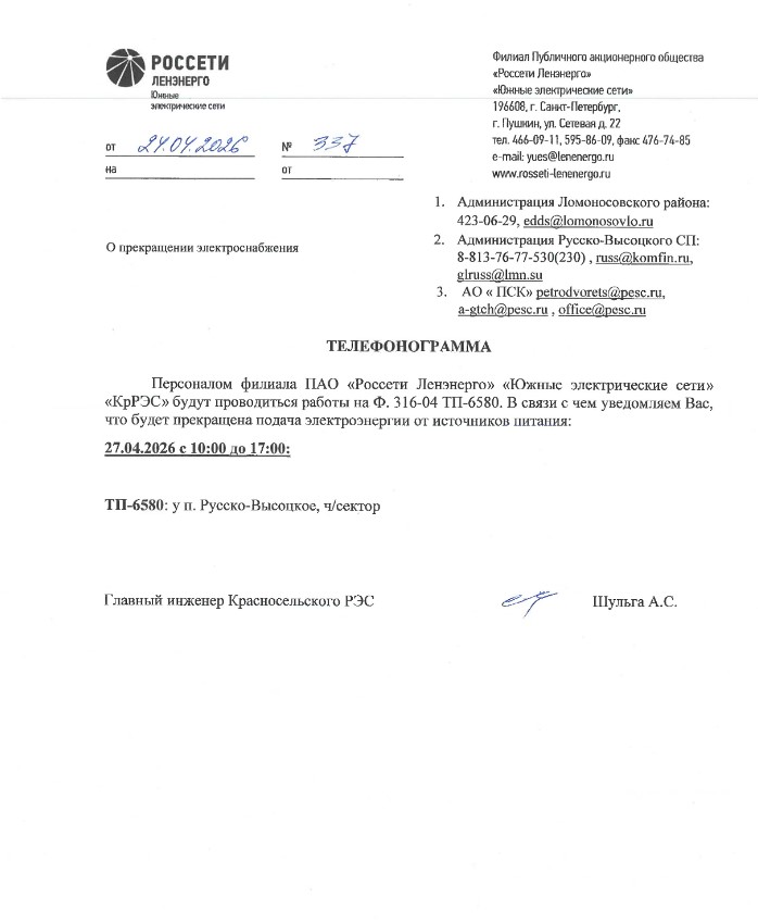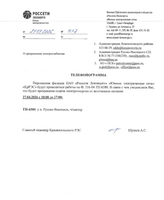 ОТКЛЮЧЕНИЕ ЭЛЕКТРОСНАБЖЕНИЯ 27.04.2026
