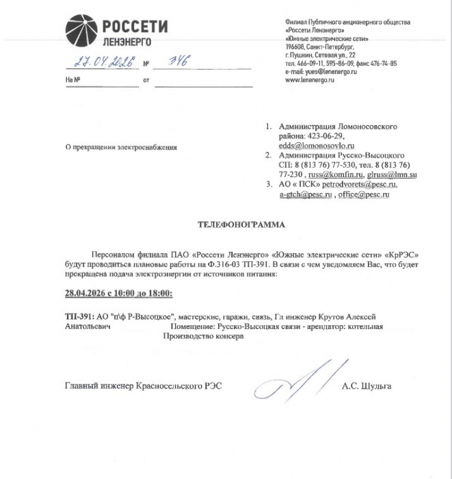 ОТКЛЮЧЕНИЕ ЭЛЕКТРОСНАБЖЕНИЯ 28.04.2026 года