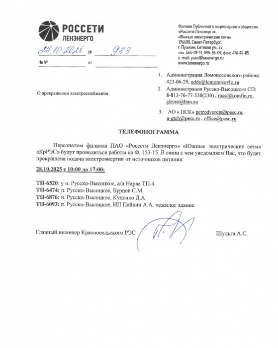 ОТКЛЮЧЕНИЕ ЭЛЕКТРОСНАБЖЕНИЯ 28.10.2025
