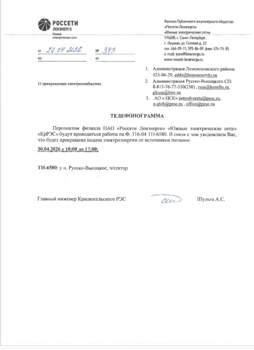 ОТКЛЮЧЕНИЕ ЭЛЕКТРОСНАБЖЕНИЯ 30.04.2026 года
