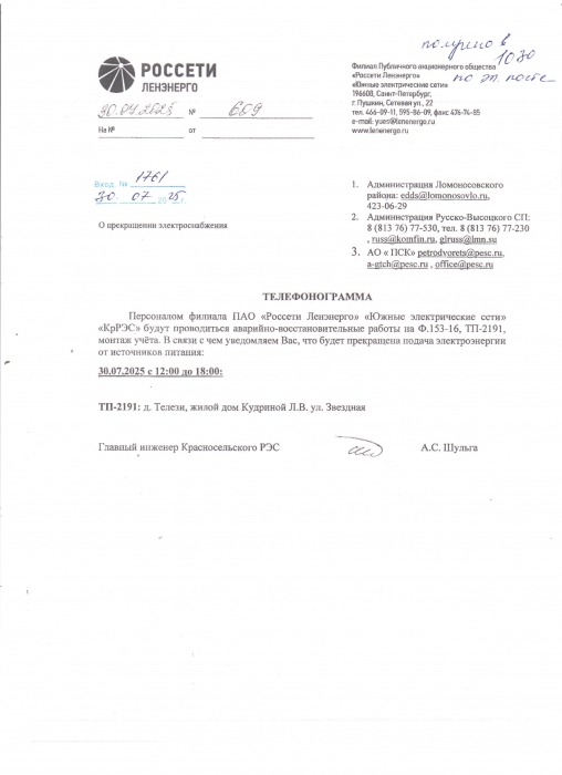 ОТКЛЮЧЕНИЕ ЭЛЕКТРОСНАБЖЕНИЯ 30.07.2025!